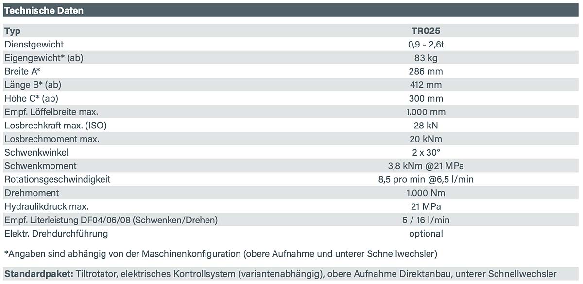 Der TR025 ist ideal für Minibagger bis 2,6t Dienstgewicht. Er ist wartungsarm gebaut, es gibt keine abstehenden Bauteile und die Schwenkzylinder schwenken nicht aus, was ihm seine schmale Baubreite beschert.